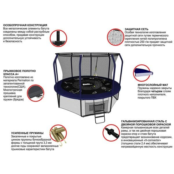 Помимо верхней защитной сетки, все батуты премиального модельного ряда UNIX line оборудованы нижней защитной сеткой, которая препятствует проникновению под прыжковое полотно батута детей, животных, а также попаданию посторонних предметов, и лестницей для удобства пользования. Так же в комплект входят специальные крепления батута к земле (колышки).